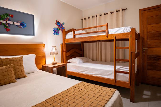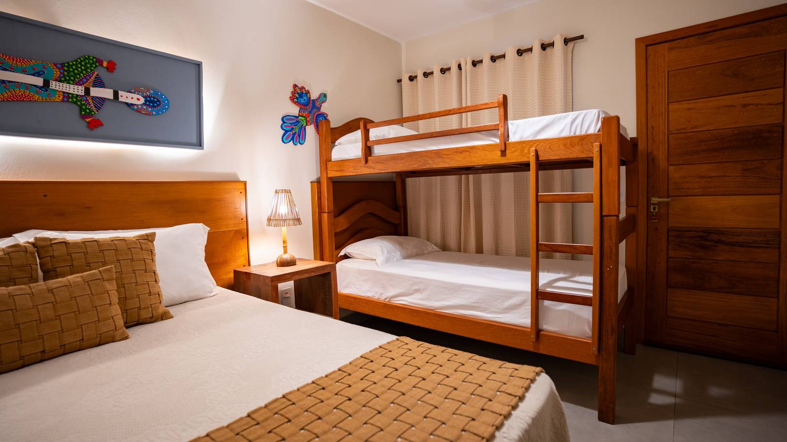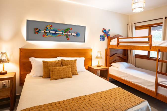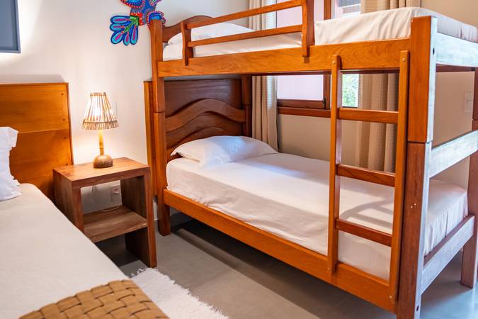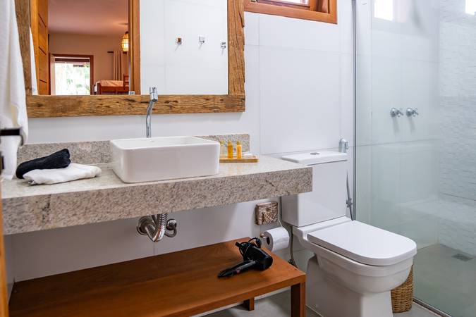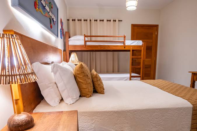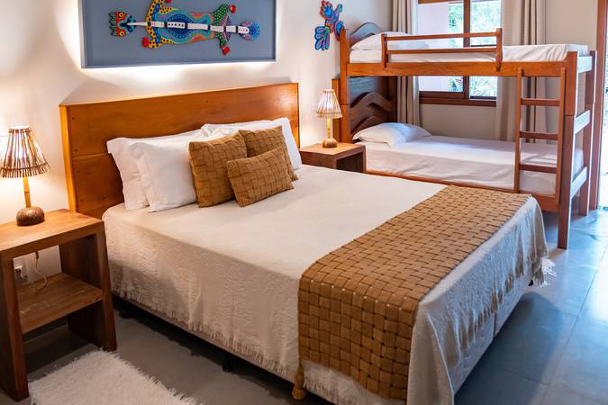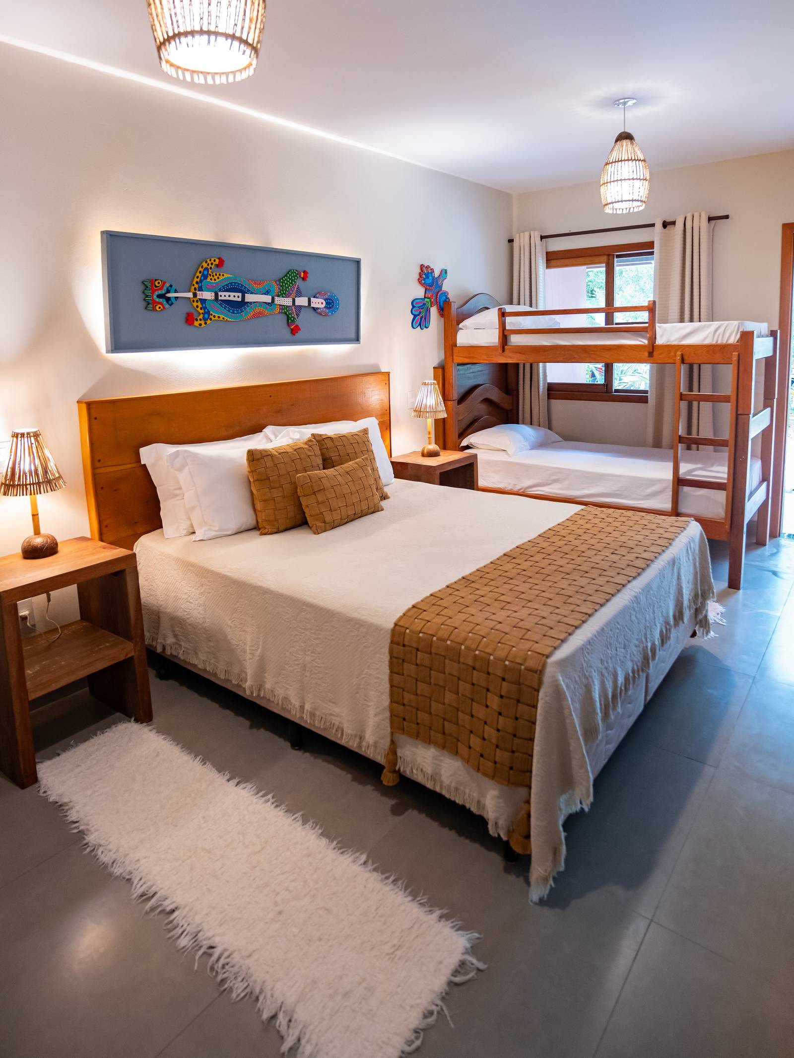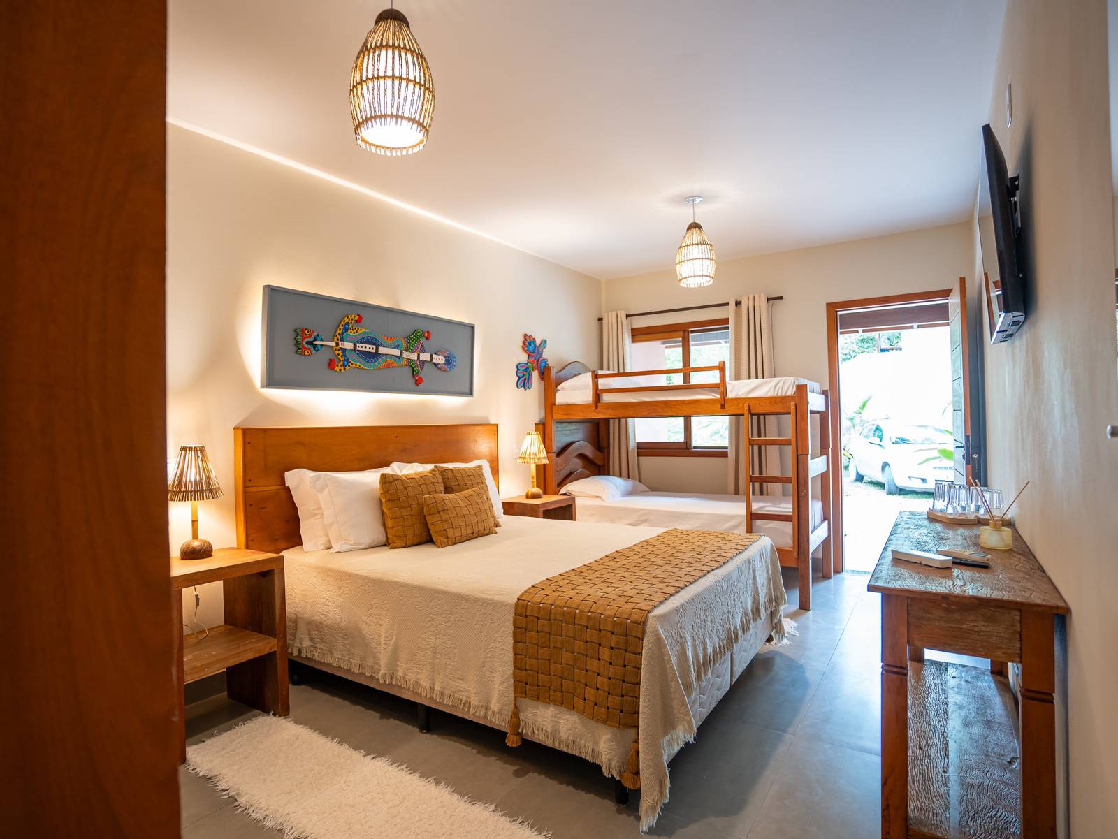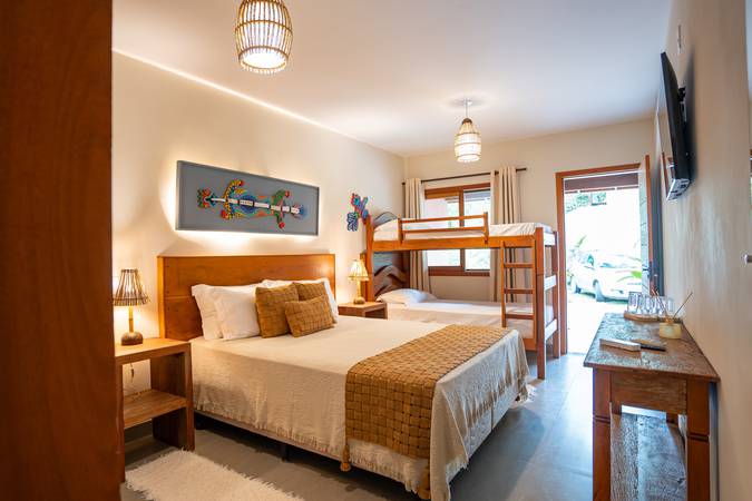 Suíte ampla e sofisticada, situada no andar térreo com varanda para o jardim, decoração pensada em cada detalhe para proporcionar conforto e exclusividade. Acomoda um casal em cama Queen com possibilidade de uma terceira e quarta pessoa em cama de solteiro beliche. Banheiro amplo com secador de cabelo, toalha própria para remoção de maquiagem e amenities Trousseau.