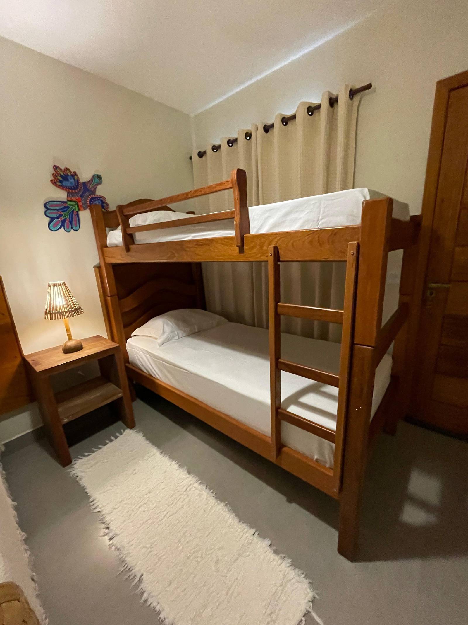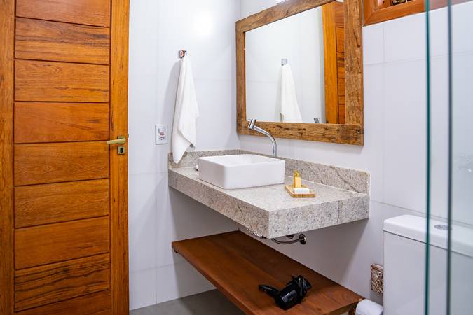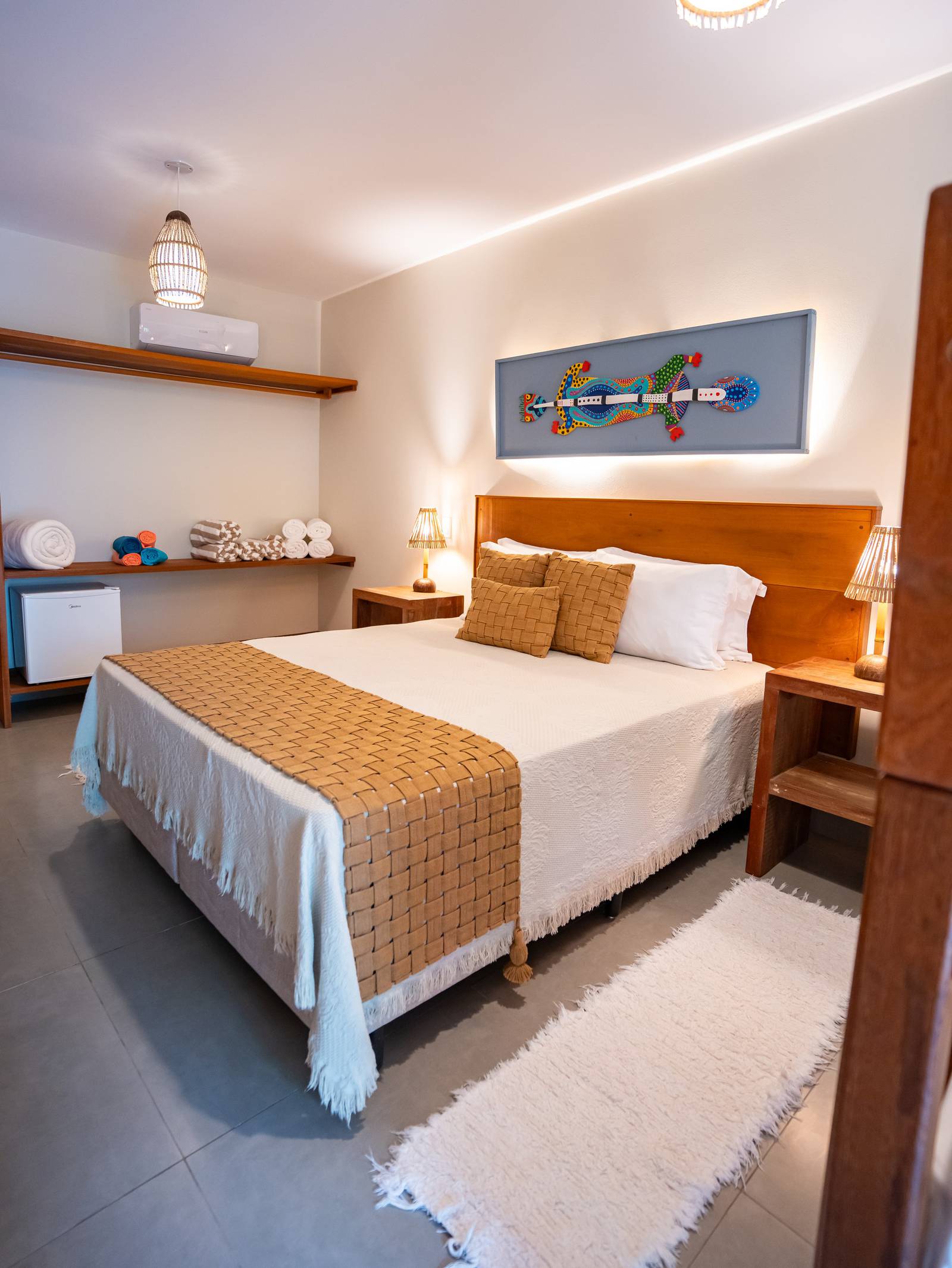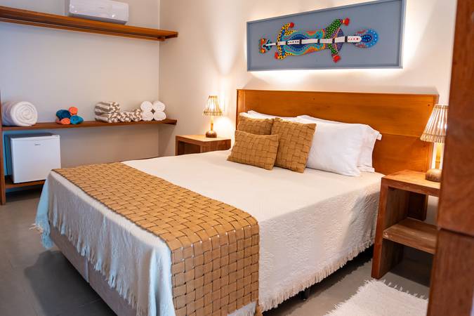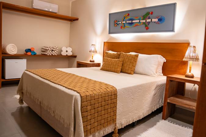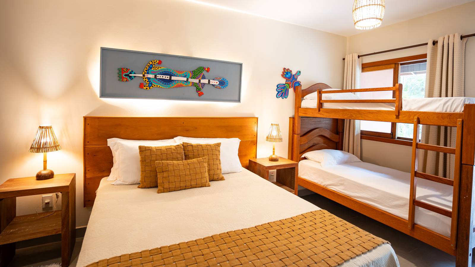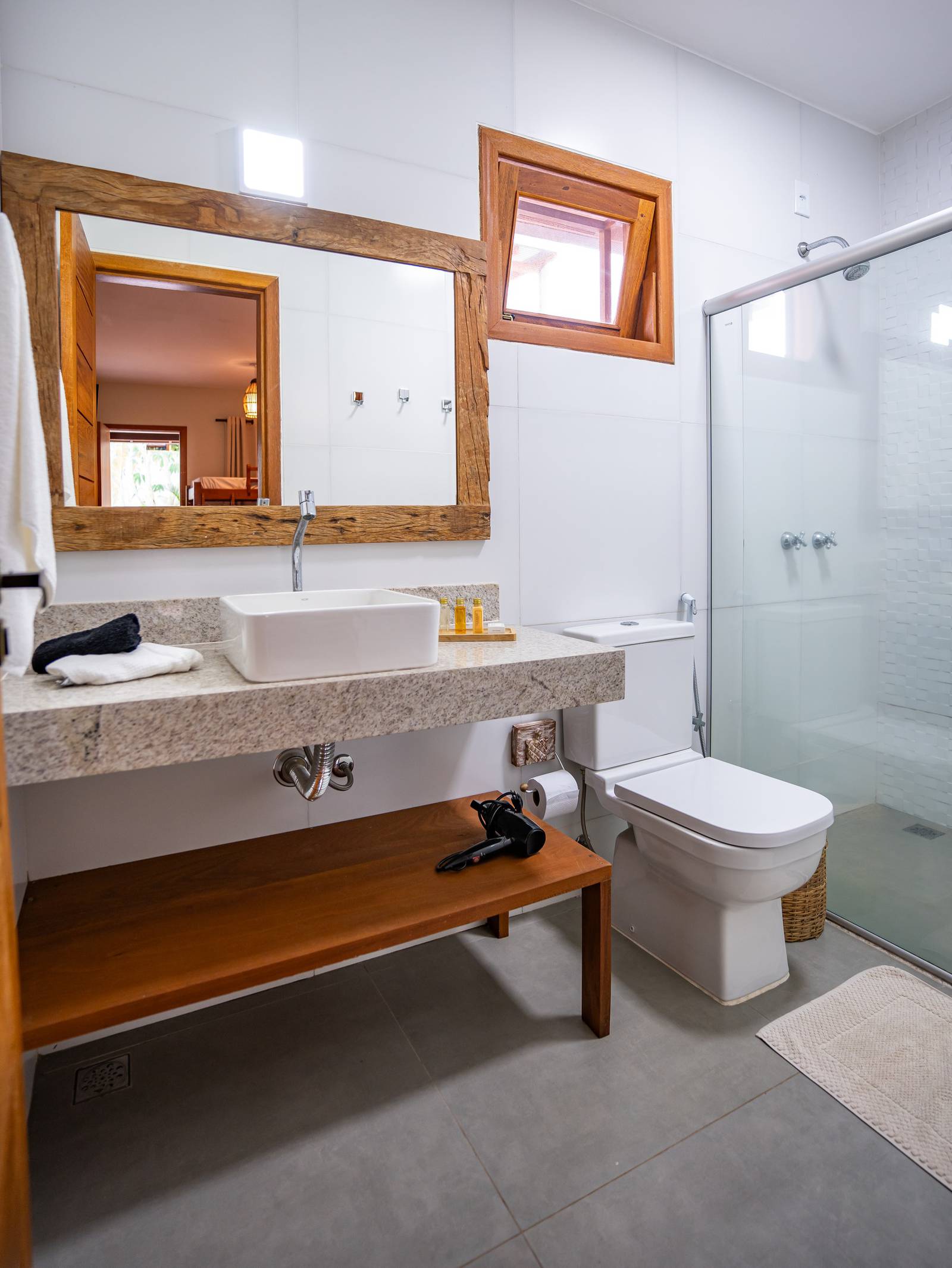 Suíte ampla e sofisticada, situada no andar térreo com varanda para o jardim, decoração pensada em cada detalhe para proporcionar conforto e exclusividade. Acomoda um casal em cama Queen com possibilidade de uma terceira e quarta pessoa em cama de solteiro beliche. Banheiro amplo com secador de cabelo, toalha própria para remoção de maquiagem e amenities Trousseau.