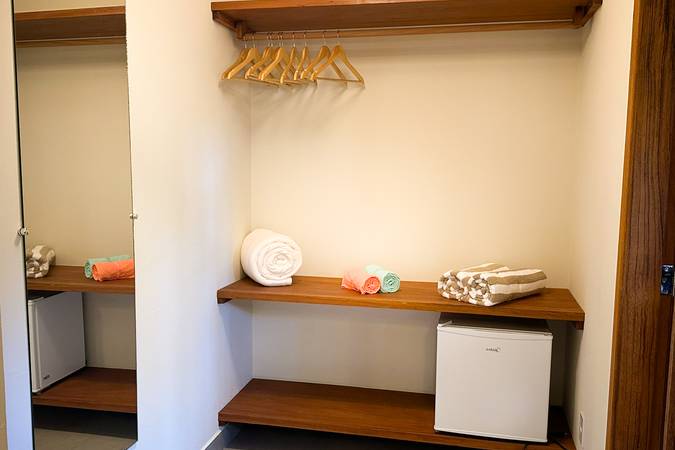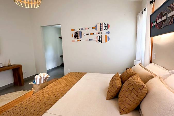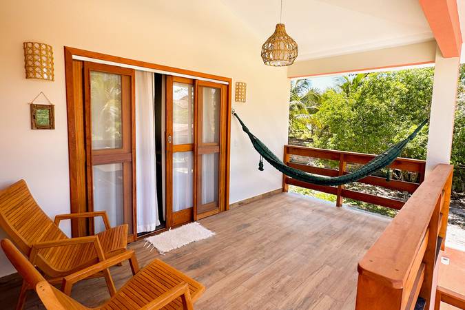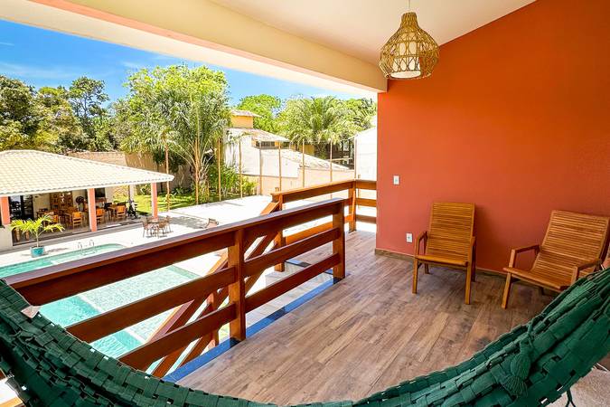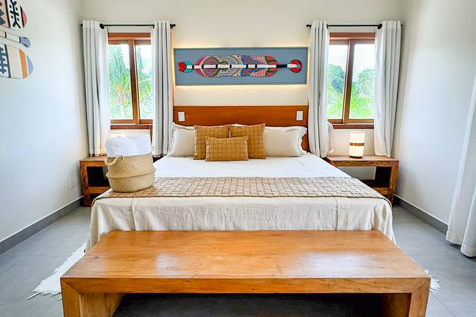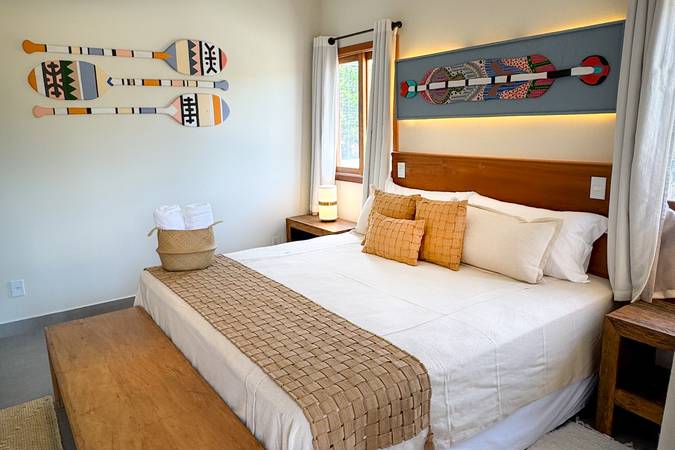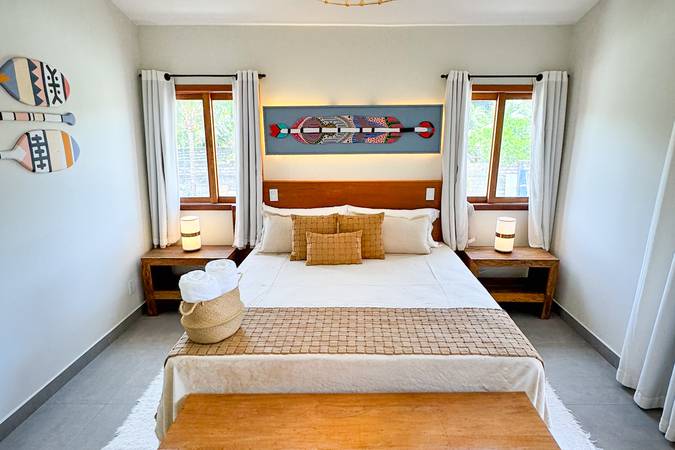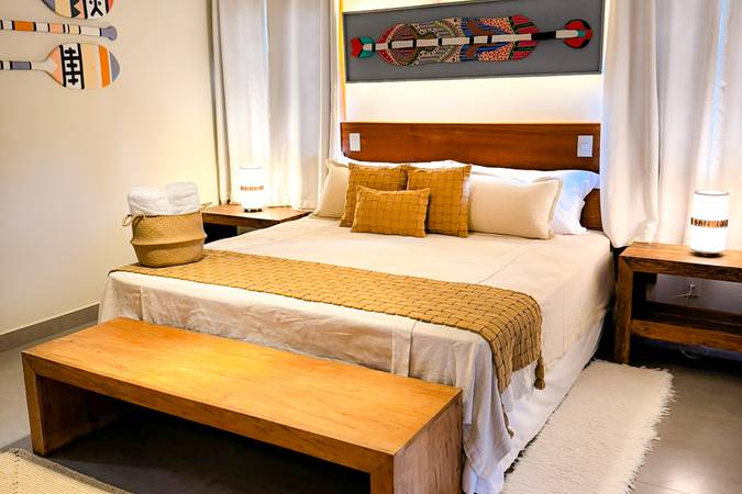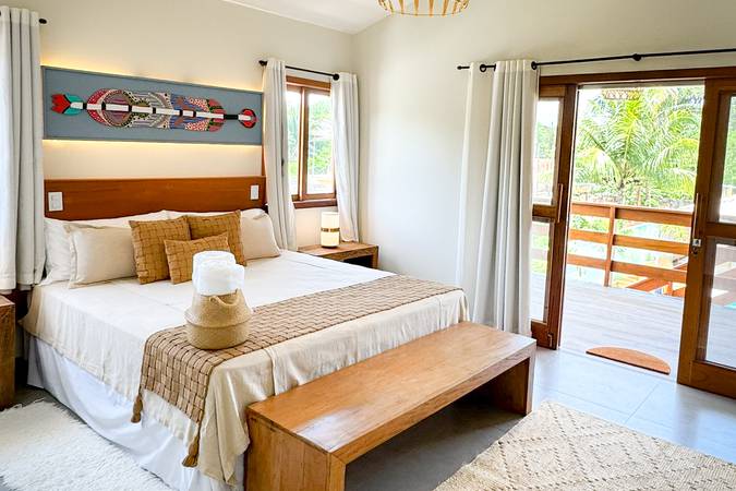 Suíte luxuosa e moderna, situada no andar superior com uma exclusiva varanda com rede e vista para a piscina. Ideal para acomodar um casal em sua confortável cama king size. Decoração requintada, aconchegante e acolhedora. Banheiro amplo com secador de cabelo, toalha própria para remoção de maquiagem e amenities Trousseau. Conta com enxoval Buddemeyer para proporcionar conforto e bem-estar.